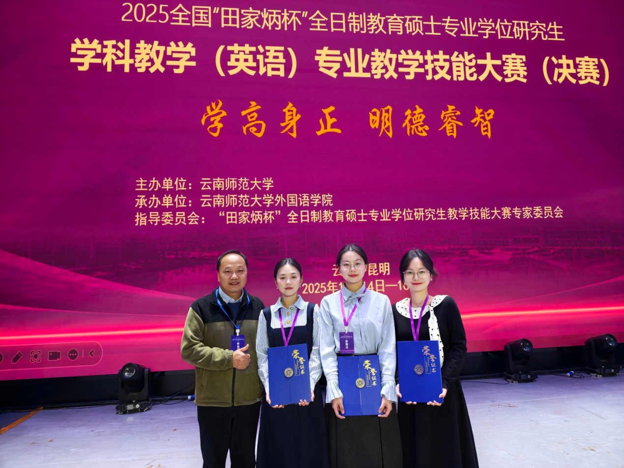 11月15日,2025年全国“田家炳杯”全日制教育硕士专业学位研究生学科教学(英语)专业教学技能大赛(决赛)在云南师范大学举办,来自全国包括6大部属师范大学在内的100所高校的264名优秀选手参加角逐。麻豆社 参赛的三位研究生表现优异,2024级学科教学(英语)专业研究生赖可萍获得二等奖,2023级学科教学(英语)专业研究生刘婧和舒佳玲同学分获三等奖的好成绩。学院姚桂招老师荣获“优秀指导教师奖”!