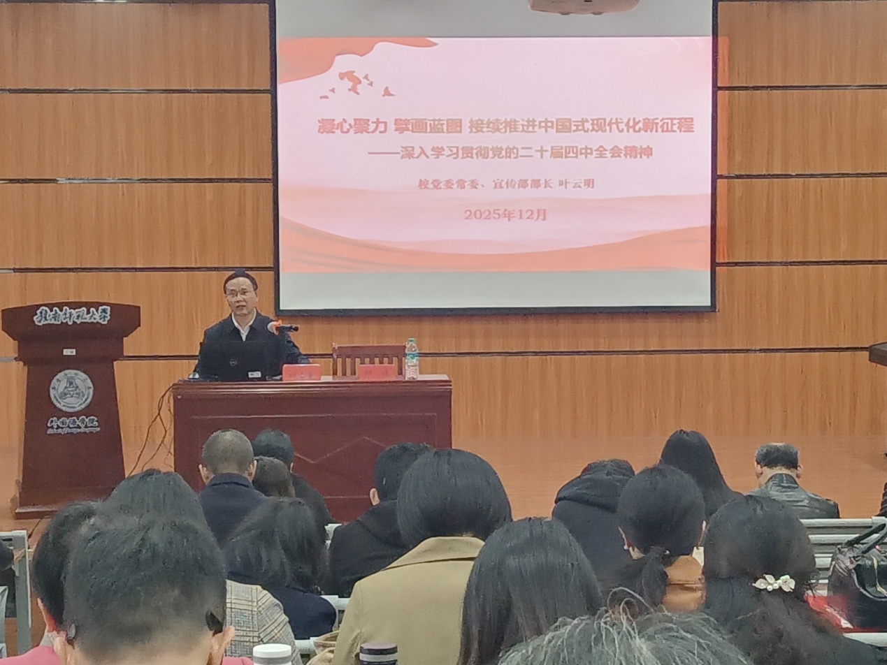 12月12日, 麻豆社 学习贯彻党的二十届四中全会精神宣讲报告会在博文楼301教室举行。学校党委常委、宣传部部长叶云明作宣讲报告。